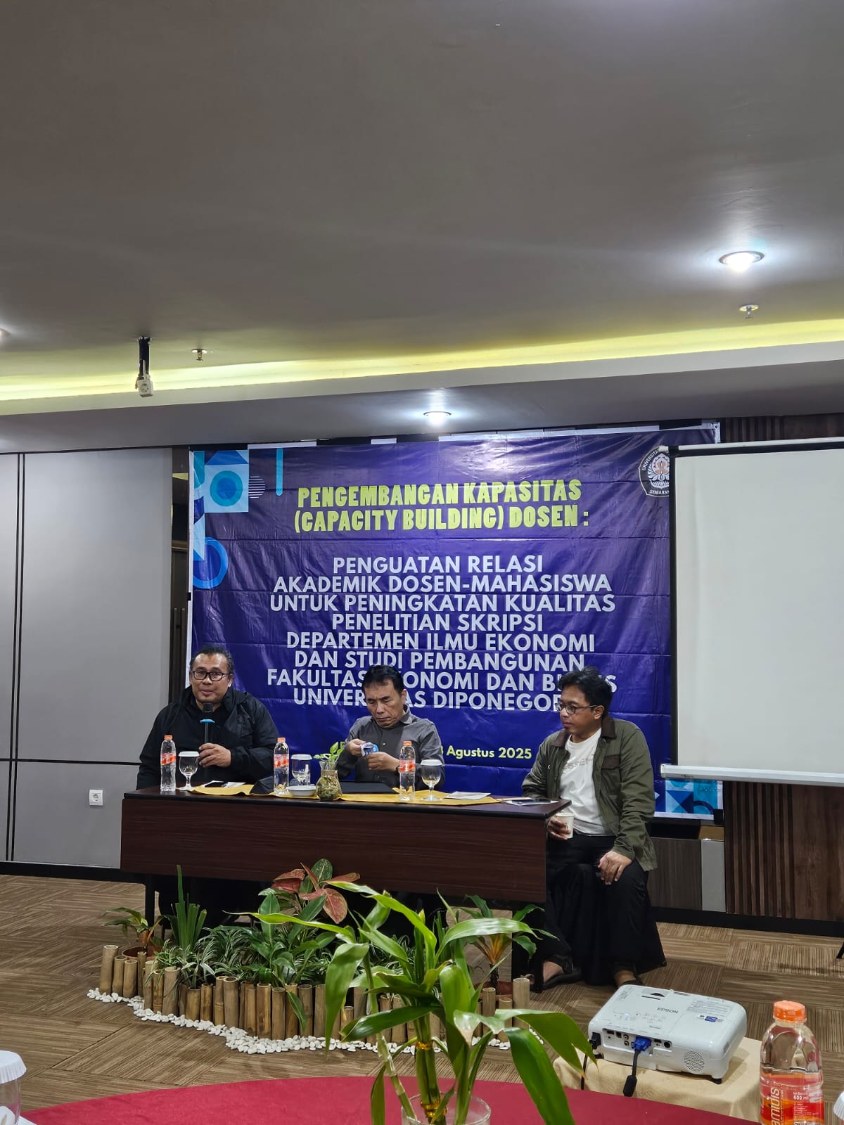 Pangandaran, 2 Agustus 2025 – Departemen Ilmu Ekonomi dan Studi Pembangunan (IESP) Fakultas Ekonomika dan Bisnis Universitas Diponegoro (FEB UNDIP) menggelar kegiatan Capacity Building Program selama tiga hari di Pangandaran, Jawa Barat. Salah satu agenda penting adalah Sarasehan Capacity Building yang digelar di Hotel Horison Palma Pangandaran. Tidak hanya menjadi wadah refleksi dan penguatan internal, tetapi juga menghadirkan momen strategis untuk menyampaikan arah baru terkait penyusunan skripsi mahasiswa. Acara ini dirancang sebagai momen penguatan internal, peningkatan sinergi sivitas akademika, serta penegasan kembali komitmen Departemen IESP dalam meningkatkan kualitas lulusan, terutama dari aspek penulisan skripsi.