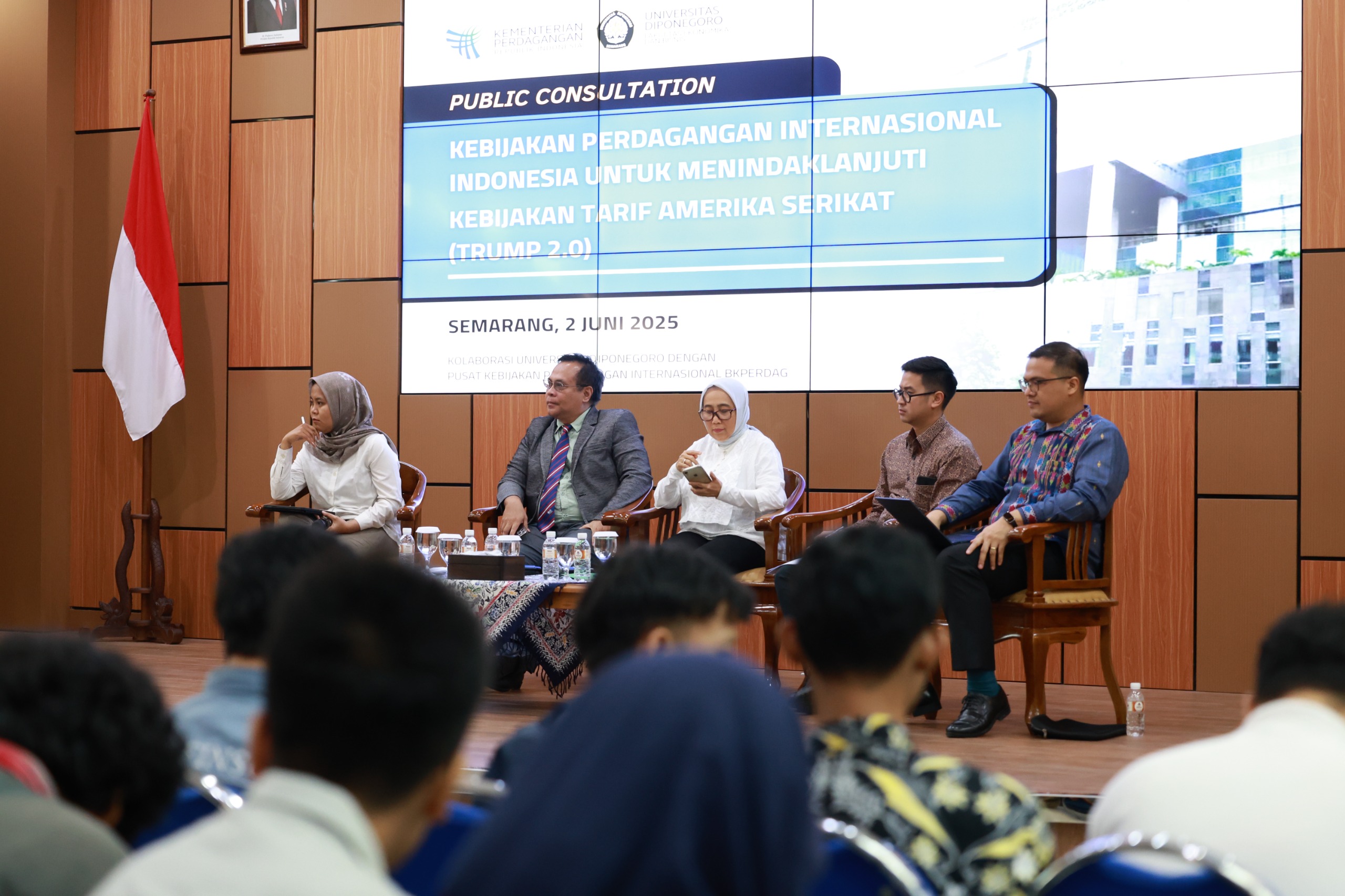 Semarang, June 2, 2025 — The Faculty of Economics and Business, Diponegoro University (FEB Undip) held a Sharing Session on Indonesia’s International Trade Policy for the Fisheries and Textile Sectors in Facing the Trade War, in collaboration with the Ministry of Trade of the Republic of Indonesia. Taking place in the Pertamina Hall, 3rd Floor of the FEB Undip Dean’s Building, this event took place from 13.00 to 16.00 WIB and was attended by hundreds of students from various study programs and FEB Undip lecturers.
