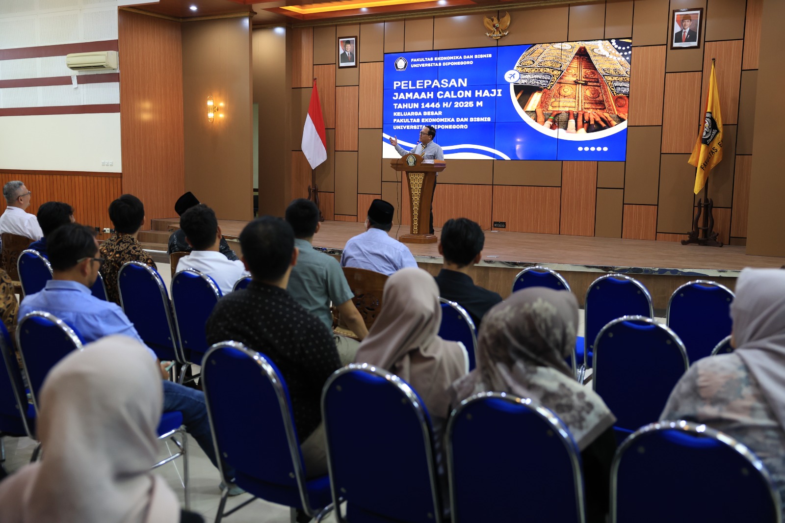 Semarang, May 14, 2025 — With full gratitude to the presence of Allah SWT, the extended family of the Faculty of Economics and Business, Diponegoro University (FEB UNDIP) held a farewell event for prospective Hajj pilgrims for 1446 H / 2025 M which took place solemnly on Wednesday, May 14, 2025, at the Pertamina Hall, 3rd Floor of the Dean’s Building, FEB UNDIP.
