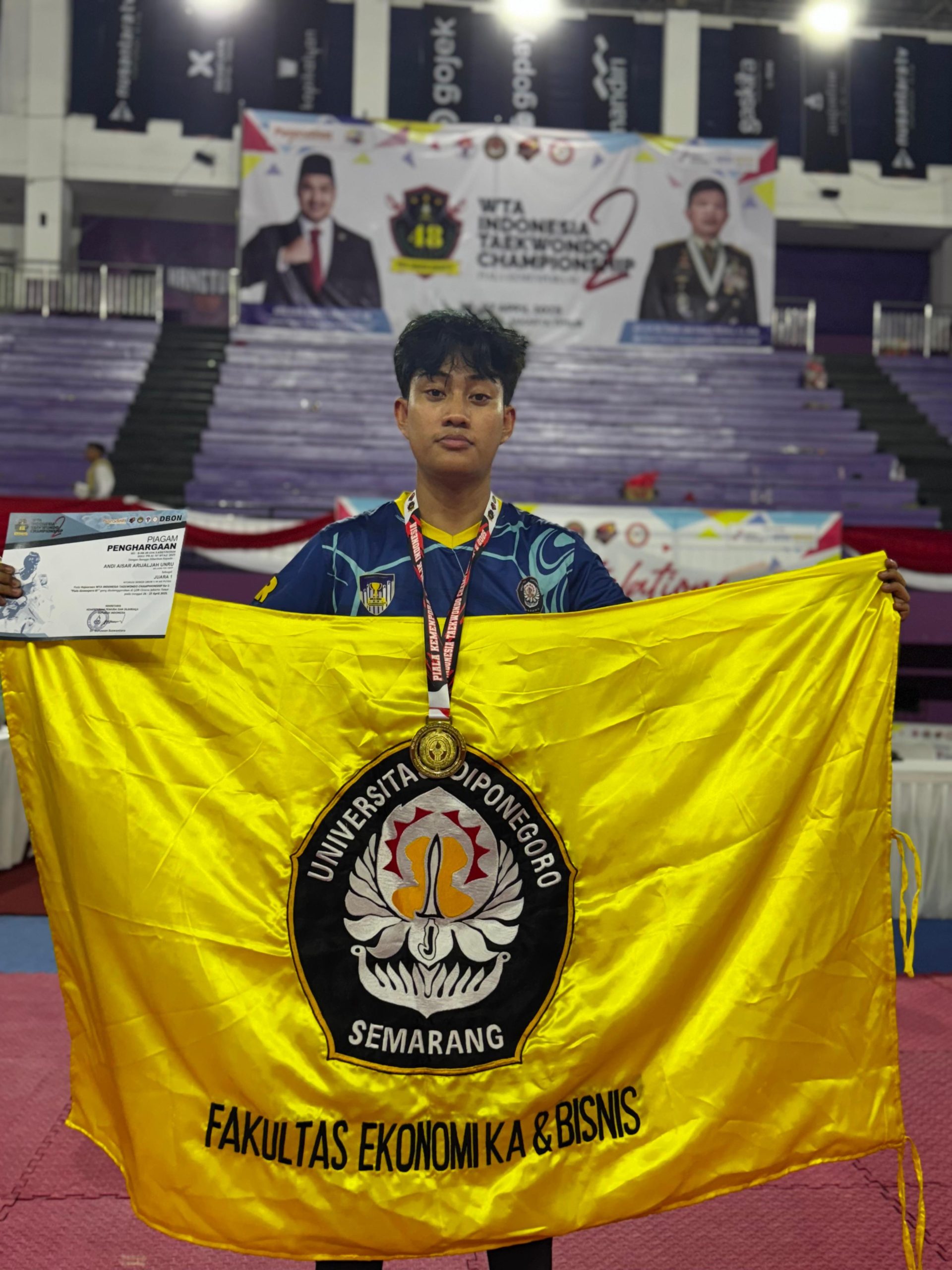 GOR Ciracas, Jakarta, 25–27 April 2025 – Two students of the Economics Study Program, Faculty of Economics and Business, Diponegoro University, Andi Aysar Arijaljah Unru (Economics 2024) and Muhammad Ghoufar Putra Papeti (Economics 2023), managed to carve out brilliant achievements at the National Taekwondo Championship “WTA Indonesia Taekwondo Championship II 2025”.