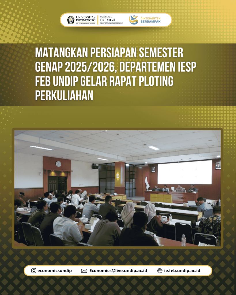 Semarang, 20 Januari — Departemen Ilmu Ekonomi dan Studi Pembangunan (IESP), Fakultas Ekonomika dan Bisnis Universitas Diponegoro, menyelenggarakan rapat persiapan perkuliahan Semester Genap Tahun Akademik 2025/2026. Kegiatan ini dilaksanakan di Ruang Sidang Utama Lantai 2 Gedung Dekanat FEB Undip dan dihadiri oleh pimpinan departemen serta dosen dari berbagai program studi di lingkungan IESP.
