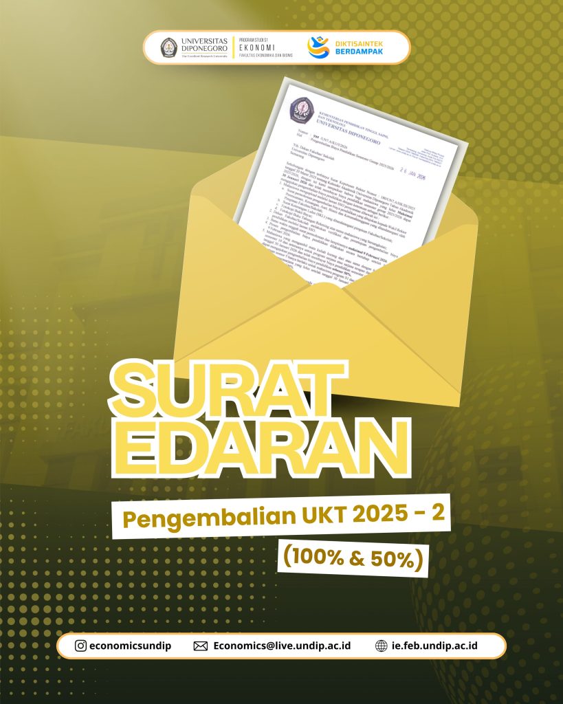 Program Studi Ekonomi Fakultas Ekonomika dan Bisnis Universitas Diponegoro menyampaikan Surat Edaran mengenai Pengembalian Uang Kuliah Tunggal (UKT) Semester Genap Tahun Akademik 2025/2026 bagi mahasiswa yang memenuhi ketentuan sebagaimana telah ditetapkan.